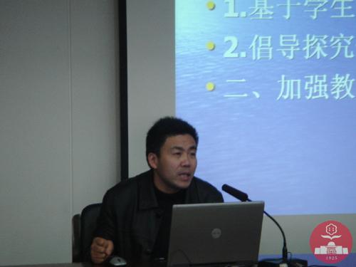 朱主任首先给教师们讲了“课堂教学改革的基本思路”。他指出,要实现学生“学得满意,考得优秀”的理想,教师的教学应当做到收放自如。围绕“放得开、收得拢”这一主题,他进行了具体的解读。在“放得开”方面,他先从“基于学生的学习”的角度谈了新的学习科学的关注点,接着提出要倡导探究型教学,并从设计要放开、过程要放开、反思要放开三个层面进行了详尽的阐述;在“收得拢”方面,他提出了“回归基础知识,突出重难点”、“整理知识体系”、“指点解题的思路与方法”、“活动过后的总结反思”、“靠精选的习题或适度的训练”等切实可行的做法。他还对常规的四种课型的研究作了说明,并指出关注每一个学生的发展是一堂好课的基本出发点。其次,朱主任指出,要改革课堂必须加强教研。他阐释了教研的理念与目标,并从构建制度和教研的方式与内容方面提出了指导性的意见和建议。