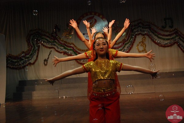 表演在高一(6)班气势磅礴的大合唱《相信自己》中拉开帷幕,场内的激情瞬间被点燃。接下来的节目更是令观众惊喜连连。在钢琴、大提琴的伴奏下,几名同学联手演绎了器乐重奏《梁祝》,柔情似水的琴声相得益彰,给观众留下了美好的回忆。学生自编自演的相声《如此学生》结合校园生活和自身实际,表演者幽默自嘲,妙语连珠,喝彩不断。“9095”舞蹈社团表演的《天竺少女》以舞动的裙摆,旋转出跃动的节奏;以曼妙的舞步,摇曳着多变的柔媚。外教sofia也登台亮相,以一首《somebody to you》为大家送来新年的祝福。教师团队也带大家重温《红星照我去战斗》、《泉水叮咚想》、《喀秋莎》等经典老歌。满头银发的耄耋老人们慷慨激昂地演唱着《团结就是力量》,全体师生站起身来拍手唱和,将晚会推至高潮。本次文艺汇演类型涵盖了合歌、健美操、相声、歌曲联唱、乐器表演、印度舞、现代舞等十多种,形式多种多样,内容精彩纷呈,带给观众一场视听的饕餮盛宴。