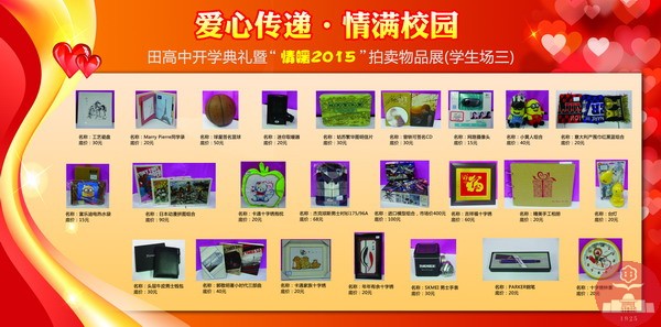 自2011年以来,每年新春开学之际,我校都会以爱之名举办“爱心传递•情满校园” 拍卖义卖活动暨开学典礼。这是田高中人的盛会,是田高中人智慧展现的舞台,更是田高中人“博爱无私”情怀传递的“纽带”。