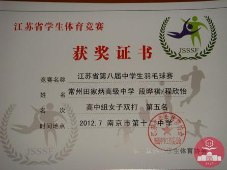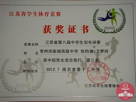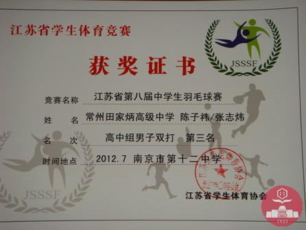 7月10日~12日在市少体校举行的2012年常州市中小学生羽毛球比赛暨第五届“百校”羽毛球比赛中,我校陈子祎、张志炜、张钧涵、尤钧立包揽高中组男子单打前四名,段烨祺、程欣怡、陈梦婷、丁梦珂包揽高中组女子单打前四名,并且获得高中组团体总分第一名。