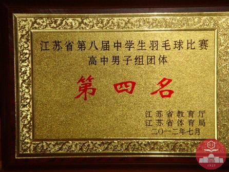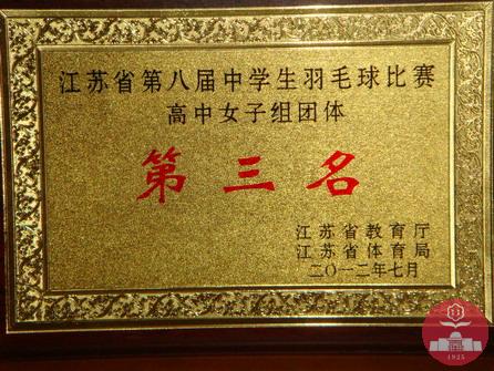 2012年江苏省第八届中学生羽毛球比赛于7月25~29日在南京市第十二中学举行,此次共有21个代表队参赛。我校男女队员共6人参加了此次比赛,取得了女子团体第三,男子双打第三,混合双打第三,男子团体第四,女子双打第五名和女子单打第七的优异成绩。