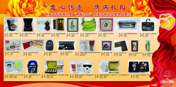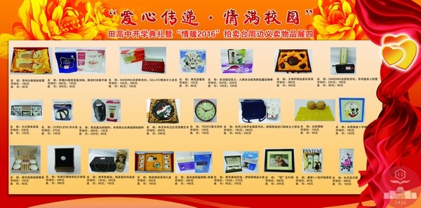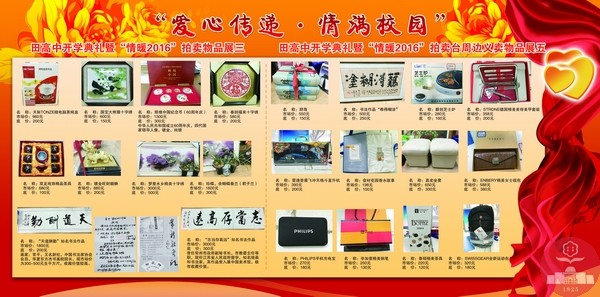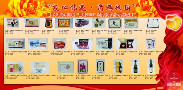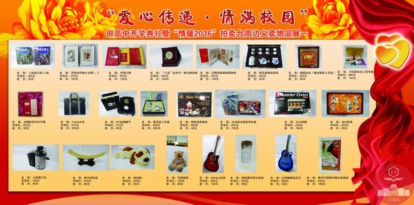 自2011年以来,每年新春开学之际,我校都会以爱之名举办“爱心传递•情满校园” 拍卖义卖暨开学典礼活动。这是田高中人的盛会,是田高中人智慧展现的舞台,更是田高中人“博爱无私”情怀传递的“纽带”。